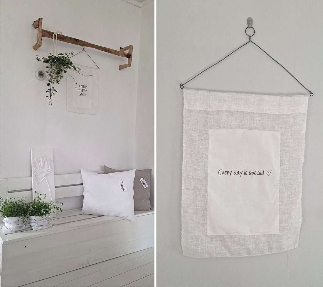 Nieuwe kussens en windlichten van wit katoen met opdruk.