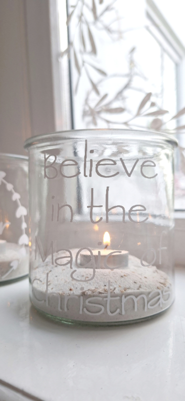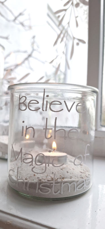 Teelicht aus Klarglas mit der Aufschrift „Believe in the magic of Christmas“.