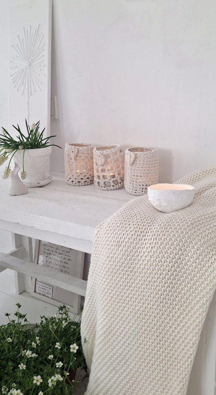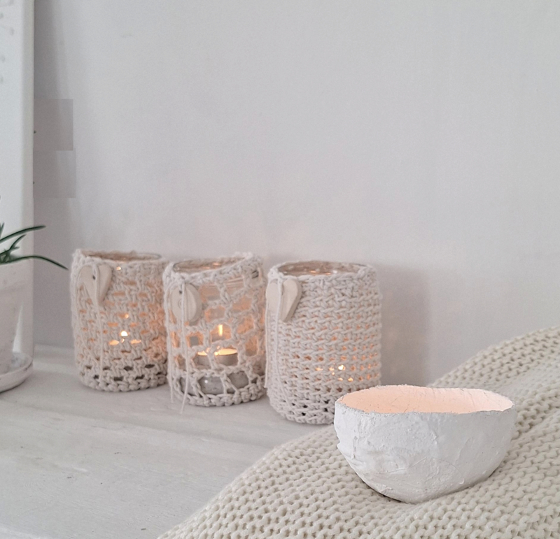 100% Handgefertigt sind diese gestrickten Windlichter aus Baumwolle. Größe Windlicht - 9 x 14 cm