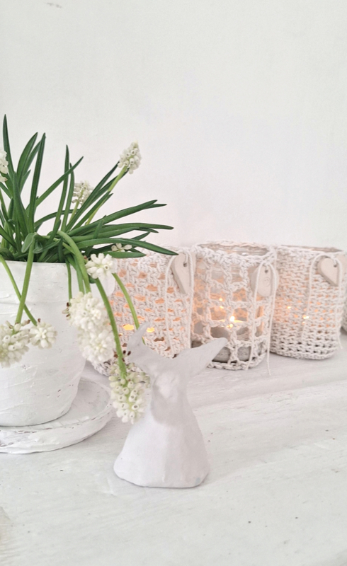 Hübsche gehäkelte Laternen aus Baumwollgarn oder Kordel. Diese Laterne ist aus weißem Baumwollgarn gefertigt. Ein schönes Detail ist die lässige Form. Größe ca. 14 x 14 cm